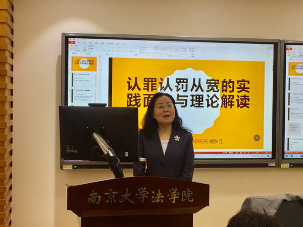熊秋红研究员在其后向同学们展示了自己的研究成果和观点。熊老师首先把认罪认罚从宽放在司法改革的背景下,认为这是在庭审实质化的背景下诞生的,设计初衷是实现案件分流、程序简化,与速裁程序相互衔接。刑诉法修改之后,认罪认罚从宽是原则也是制度。熊老师发言的第二部分是认罪认罚从宽制度的实践逻辑。熊老师认为,该制度是以效率为导向,从刑事诉讼法宏观的发展历程上看,这是可以得到印证的。接下来熊老师转向了制度的理论解读,从实体法层面看,这是和刑事政策相连的;从程序法层面看,研究员提出了一个创新性的观点,认为这是程序的第四范式体现,是一种合作而放弃审判的制度。当然,作为一个新的制度,实践和理论都有不完善的地方,在一这问题上熊老师的观点和孙老师一致,认为认罪认罚制度在被告人上诉权、法官参与、适用范围和强制辩护等方面存在一定争议。