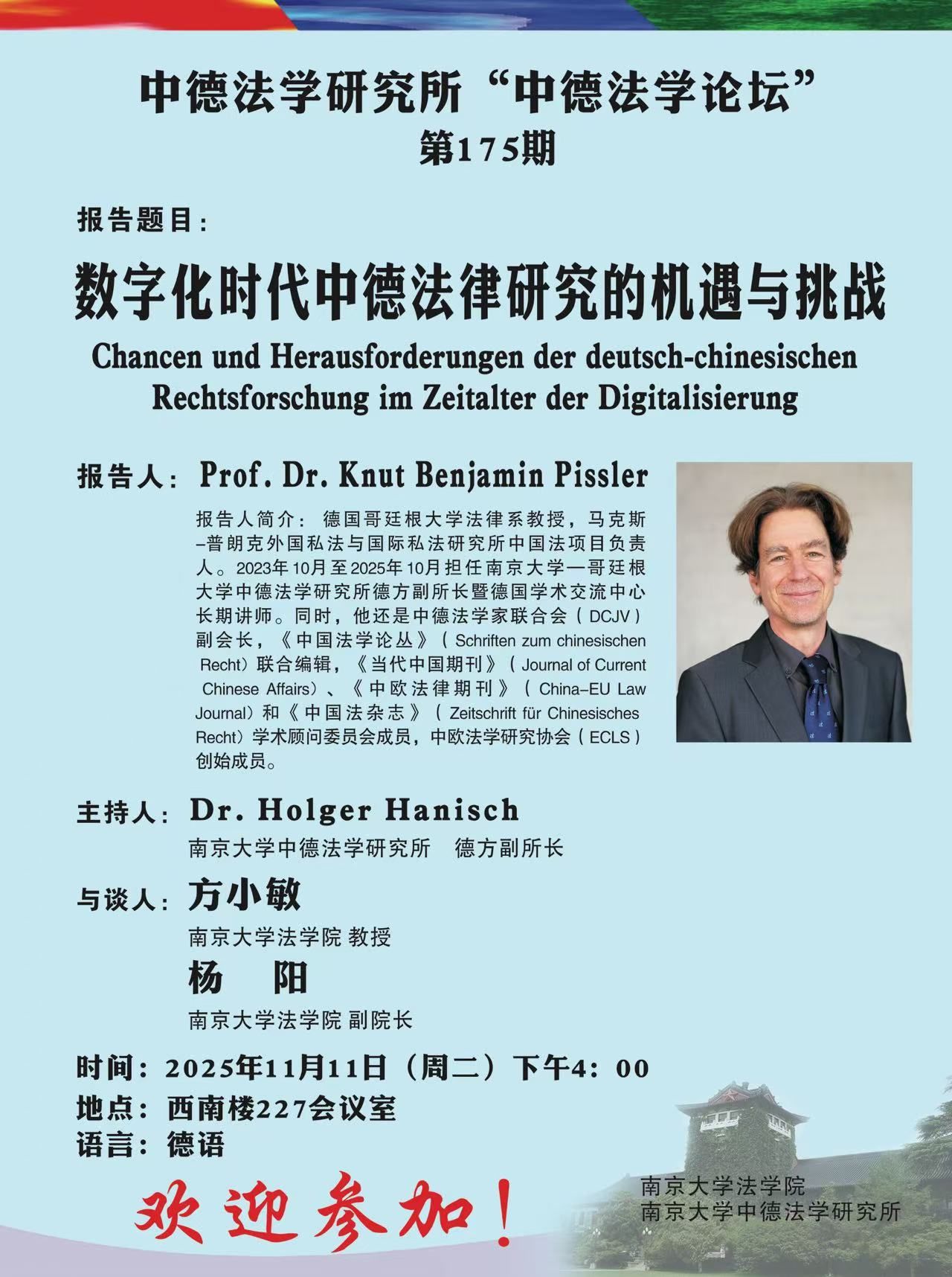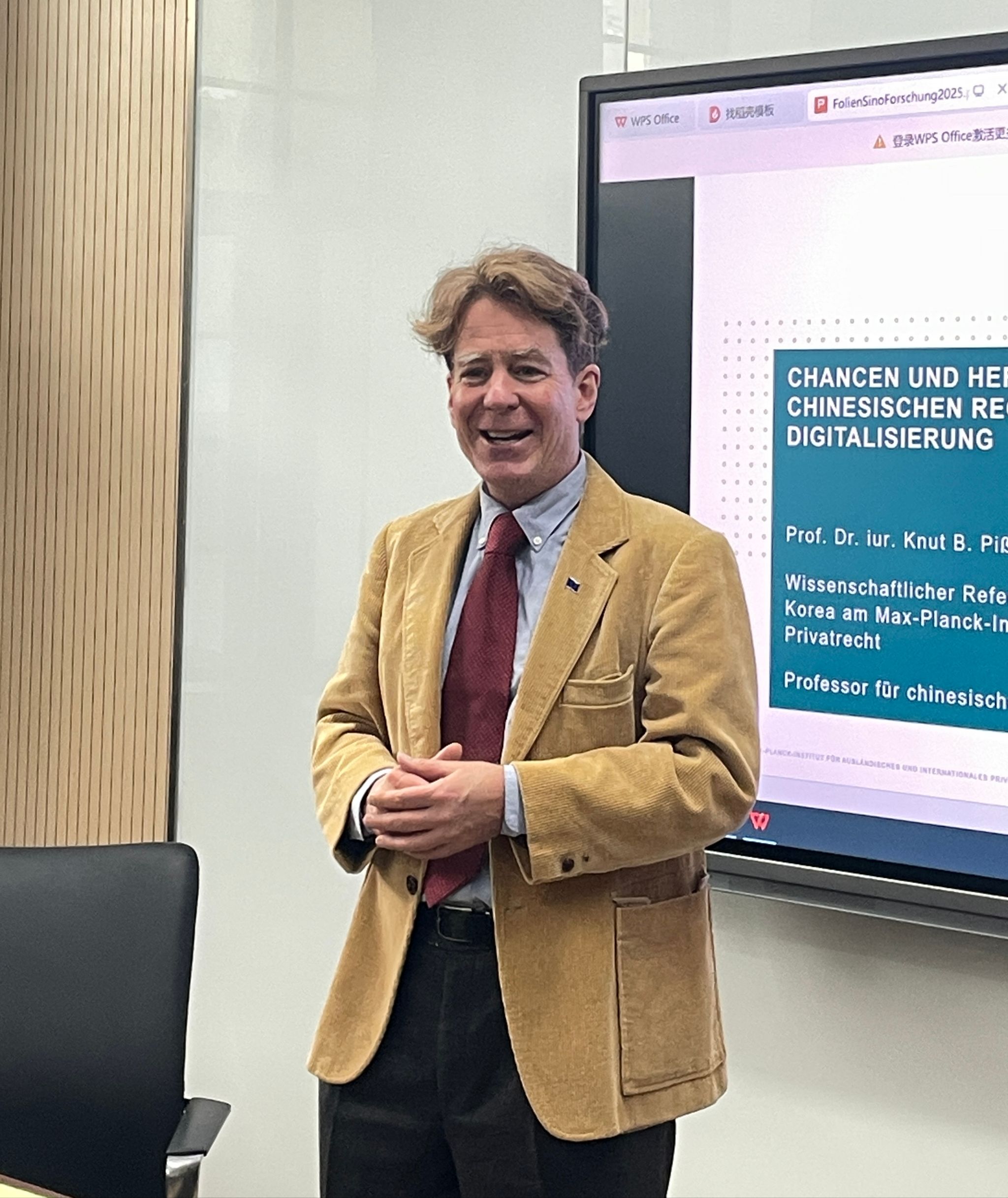 2025年11月11日,应成人网 中德法学研究所邀请,德国哥廷根大学法律系教授、马克斯-普朗克外国私法与国际私法研究所中国法项目负责人Knut Benjamin Pissler以《数字化时代中德法律研究的机遇与挑战》为题,为第175期“中德法学论坛”做学术讲座。