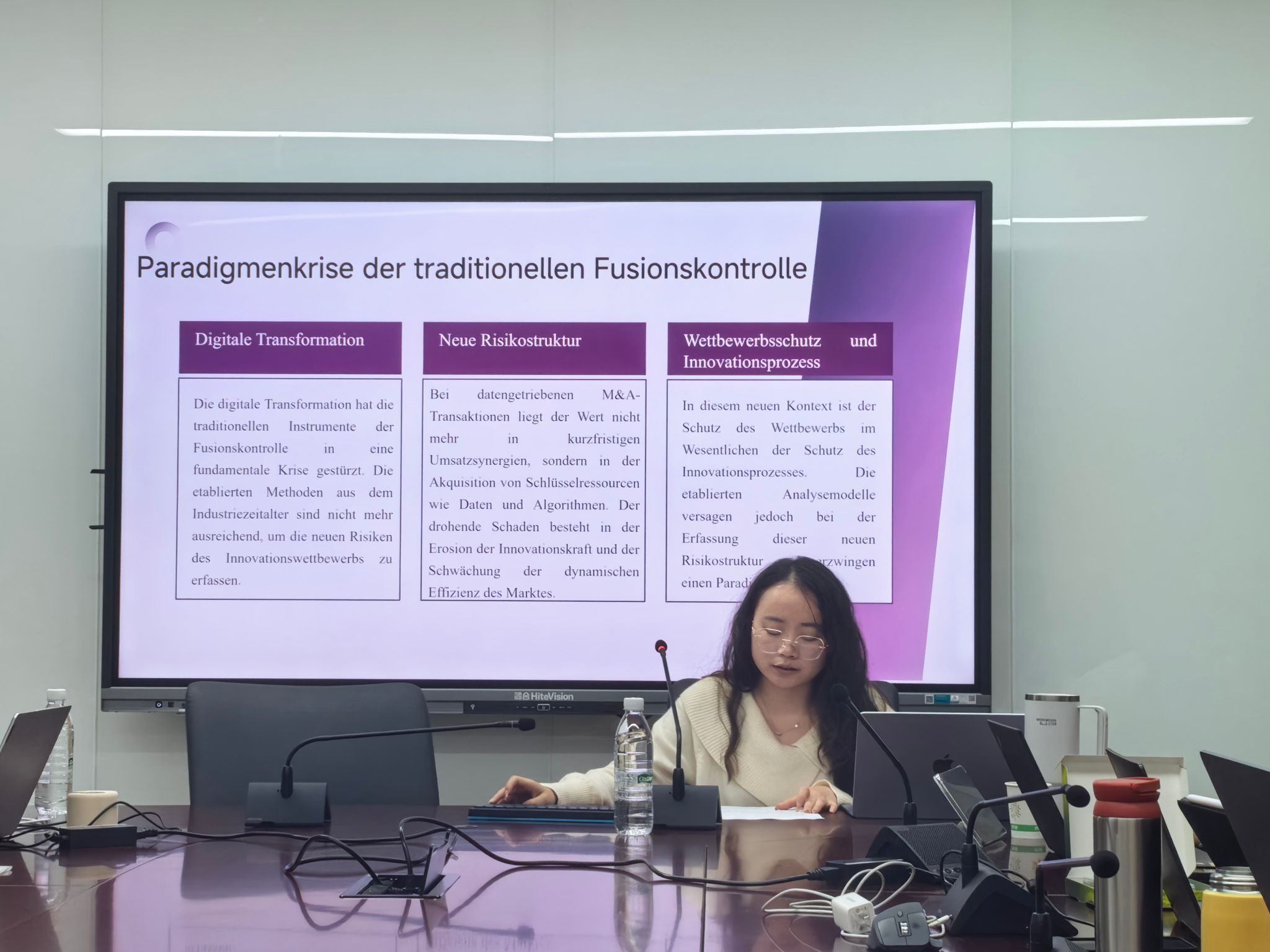 第四位王捷璇同学以《并购控制中的创新损害新理论》为题,系统阐述了数字时代反垄断法在并购控制领域面临的理论革新需求。报告指出,传统以价格为中心的静态竞争分析框架难以有效规制以数据和技术为核心价值的数字并购交易,这类交易可能通过扼杀潜在竞争、削弱创新活力、封闭生态系统等方式造成“创新损害”。在制度回应层面,报告比较了德国、欧盟和中国的监管实践。中国在2022年修订的《反垄断法》中虽将“鼓励创新”明确定为目标,并在平台经济指南等文件中要求考量创新频率、速度及颠覆性创新等因素,但仍面临概念模糊、评估工具缺失、规则碎片化等操作层面的挑战。