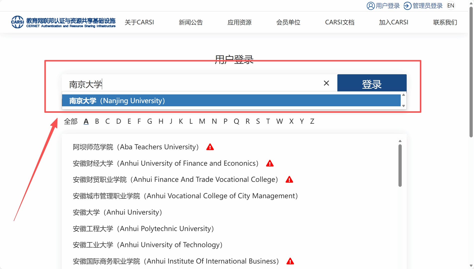 Step 4:自动跳转回数据库成人网,页面右上角显示「NJU_CarSi」,即登录成功。