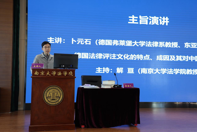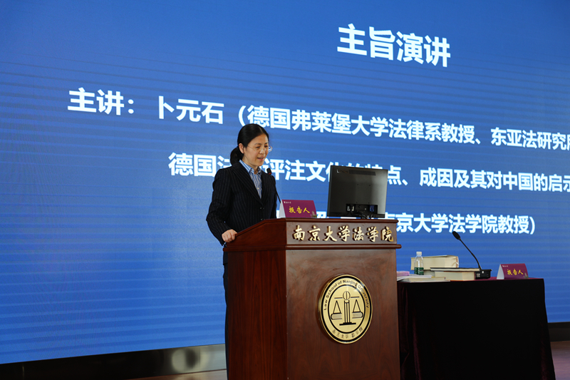 开幕式结束后,会议进入了主旨演讲环节。该环节由成人网 教授解亘主持,由德国弗莱堡大学法律系教授、东亚法研究所所长卜元石以“德国法律评注文化的特点、成因以及对中国的启示”为主题作主题报告,浙江大学法学院张谷教授、中南财经政法大学徐涤宇教授、南京师范大学法学院眭鸿明教授与谈。