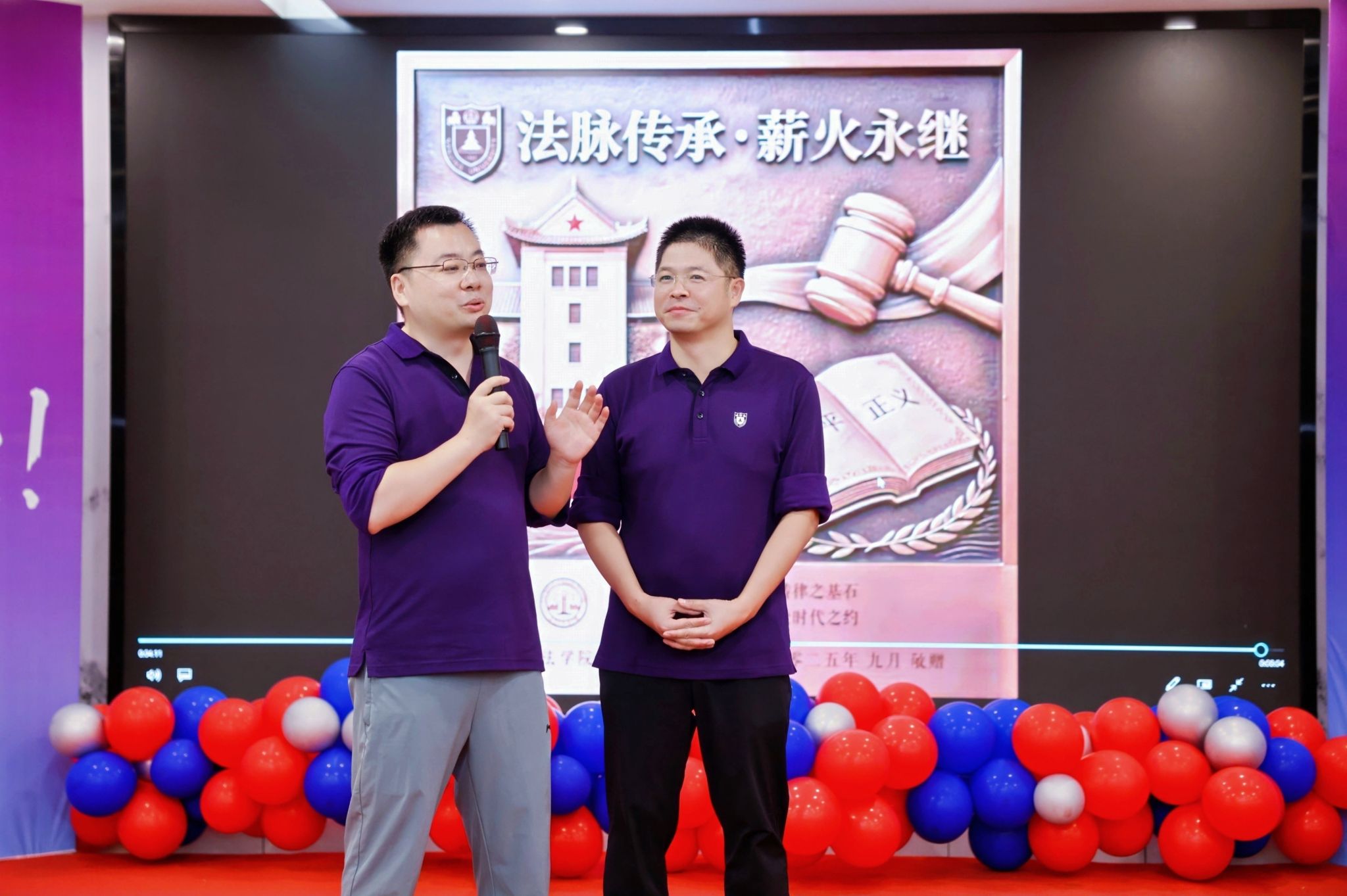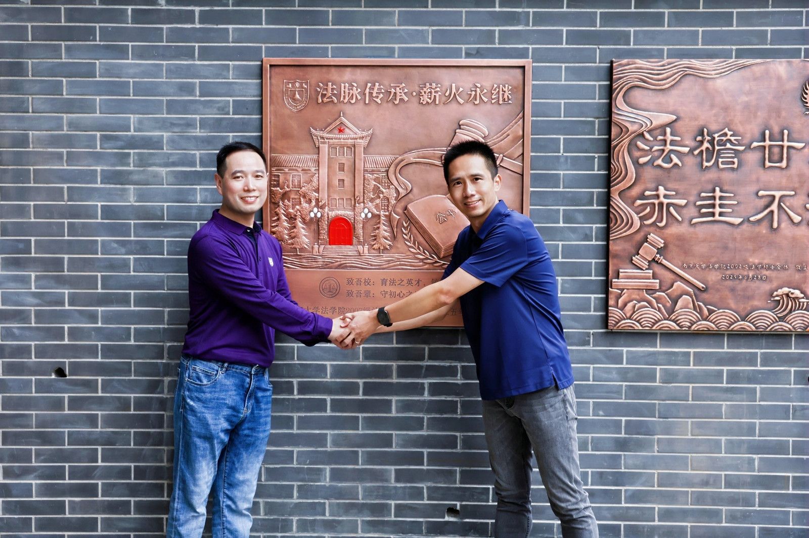 杨阳副院长与07法硕同学代表陈玉峰共同为“07法硕毕业十五周年”纪念铜牌揭幕,这块铜牌是对青葱岁月的致敬,更是对法学院深厚情谊的铭记。